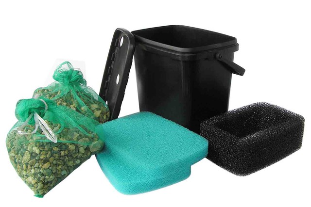 The kit consists of a plastic bucket, a plastic lid, 3 pieces of foam filters and two mesh bags for bio-ball storage.